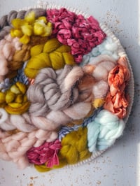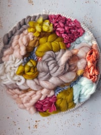 This sweet 8” roundie is soft, yet bold. The organic woven texture pops off the hoop for a truly 3-dimensional piece of art.